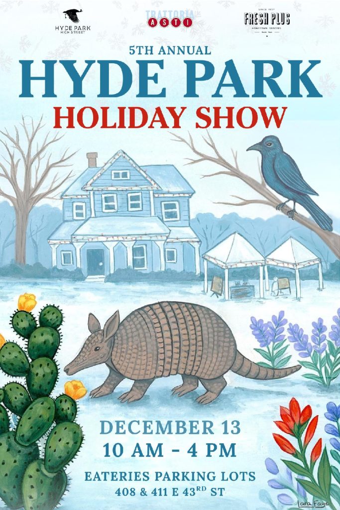 I am so pleased to announce that the 5th Annual Hyde Park Holiday Art Fair has been scheduled for December 13, 2025. It will be held from 10am to 4pm, and this year, booths will be set up in both the Quack’s and Fresh Plus parking lots near the corner of 43rd and Duval Streets in Austin, TX.